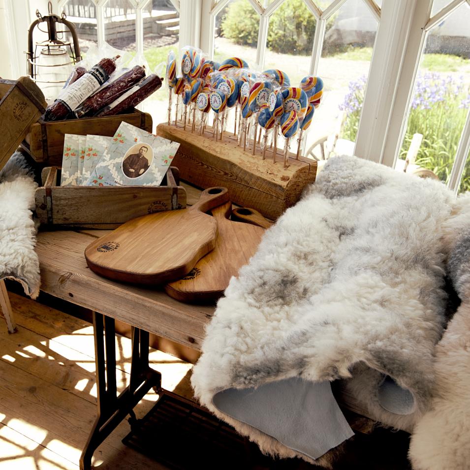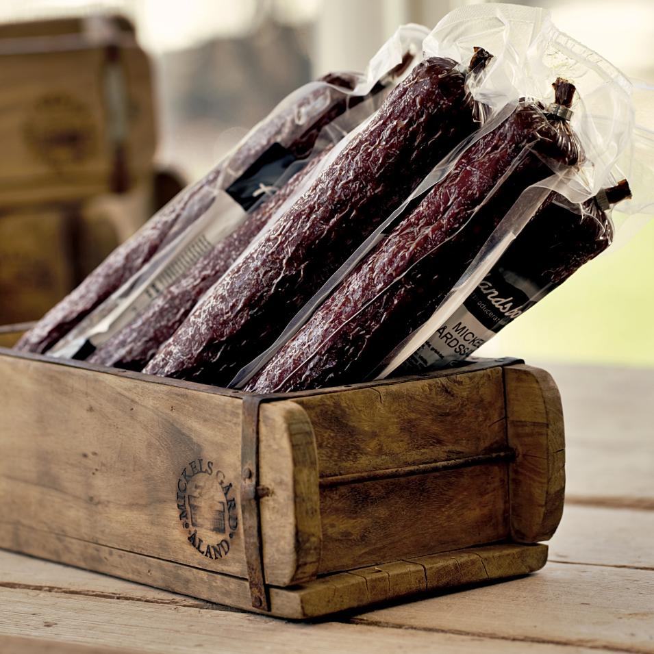 Försäljning av gårdens ekologiska naturbeteskött, salami och fårskinn (begränsad mängd).